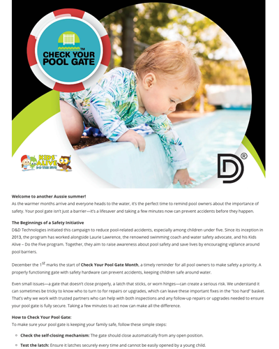 It is simple and effective to be involved and show your support for Check Your Pool Gate Month. You can be as involved in as small or big way as you choose; from sharing messages online to offering direct promotional deals to customers.